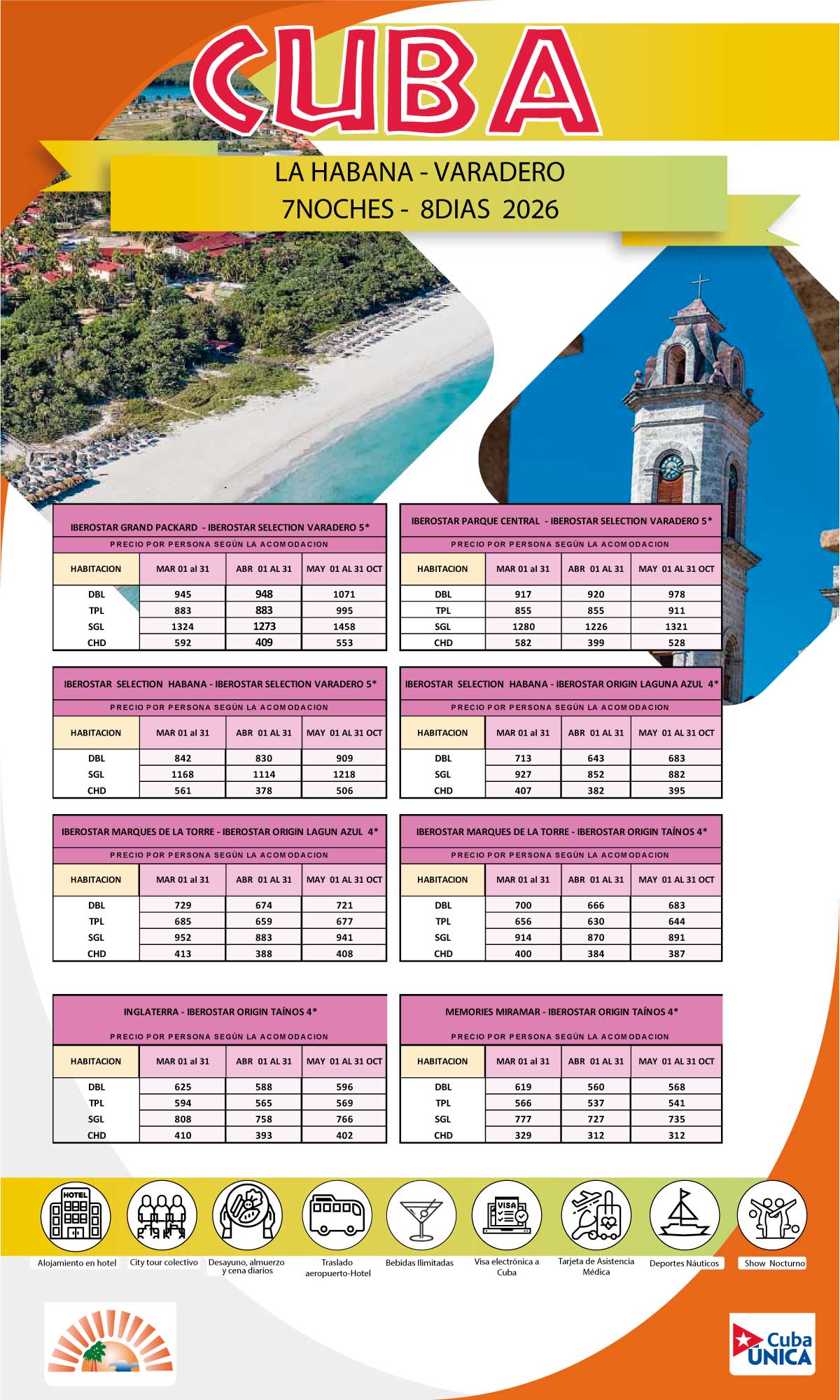 - Alojamiento 04 noches en Varadero, todo incluido.